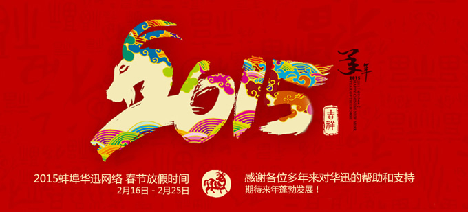 蚌埠華迅網(wǎng)絡(luò)科技有限公司2015新年放假時(shí)間為2015年2月16日至2月25日,假日期間如有需求請(qǐng)聯(lián)系:0552-3711772 15255232273