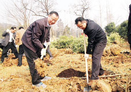 上午10時許,一到植樹現(xiàn)場,周春雨、白金明、何金良、顧世平、方志宏等市幾大班子領(lǐng)導(dǎo)就迅速融入到植樹勞動的大軍之中。他們興致勃勃地拿起鐵鍬,同在場的干部一起揮鍬挖土,將一棵棵樹苗植入樹坑,培土,澆灌,每道工序都做得十分認真。市委書記周春雨、市長白金明一邊植樹,一邊與市林業(yè)局、住建委負責(zé)同志交談,了解全市植樹造林及“綠滿珠城”工作開展情況。經(jīng)過一番緊張勞動,300多棵桂花、櫻花等樹木昂然挺立,在和煦的春光中綻放蓬勃生機。