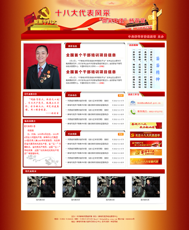 核心提示:【代表簡介】 楊苗苗,女,漢族,1976年6月出生,2001年6月加入中國共產(chǎn)黨,蚌埠市公交集團107路負責人兼1060號車駕駛員,先后榮獲省交通系統(tǒng)先進生產(chǎn)者、省五一巾幗標兵、省優(yōu)秀共產(chǎn)黨員、全國五一勞動獎章、全國創(chuàng)先爭優(yōu)優(yōu)秀共產(chǎn)黨員等榮譽稱號。 訪問地址